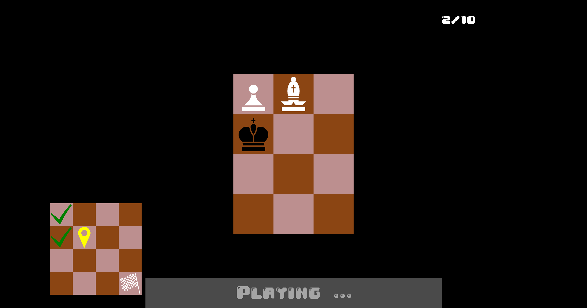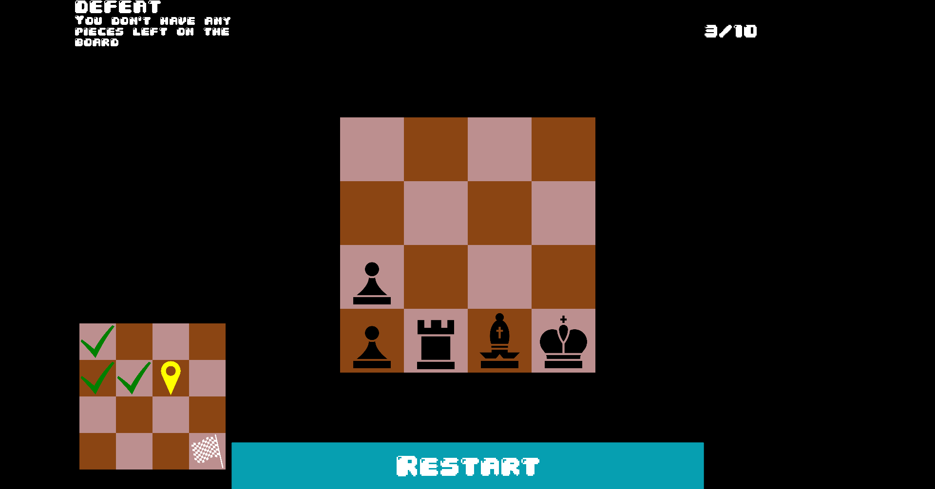 Puzzle is solved by capturing the black king. You lose if white king is captured, there are no white pieces on the board or you have reached the max moves.